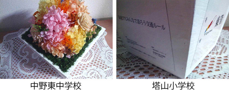 障がい者支援及び地域支援を目的として会社付近の中野東中学校及び塔山小学校にプリザーブドフラワー鉢を寄贈いたしました。